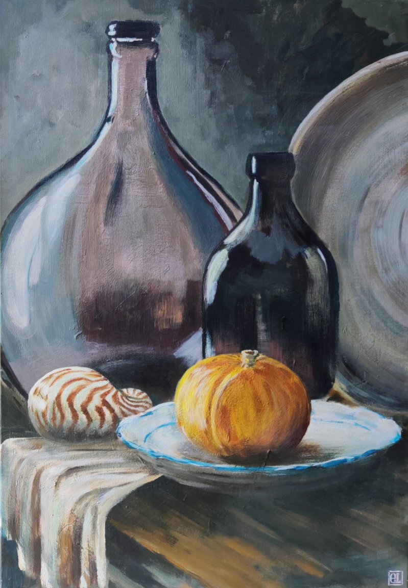 Glazen fles, pompoen en nautilus ~ 100x70 cm