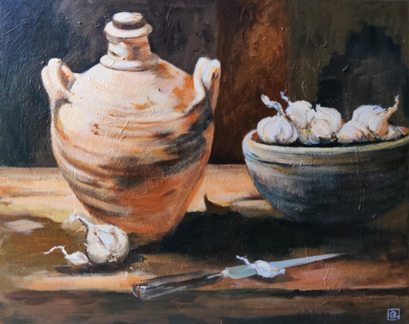 Kruik en knoflook ~ 80x100 cm