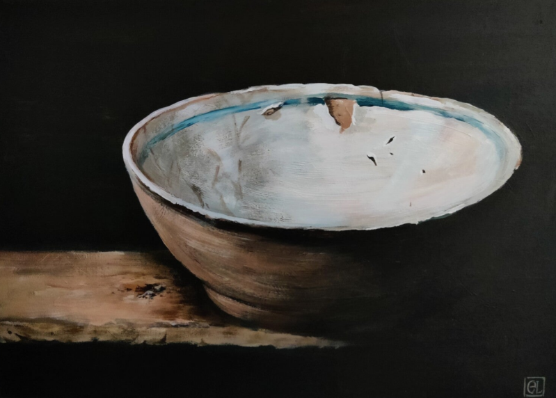 Kapotte kan met scherven ~ 30x23 cm (zonder lijst)